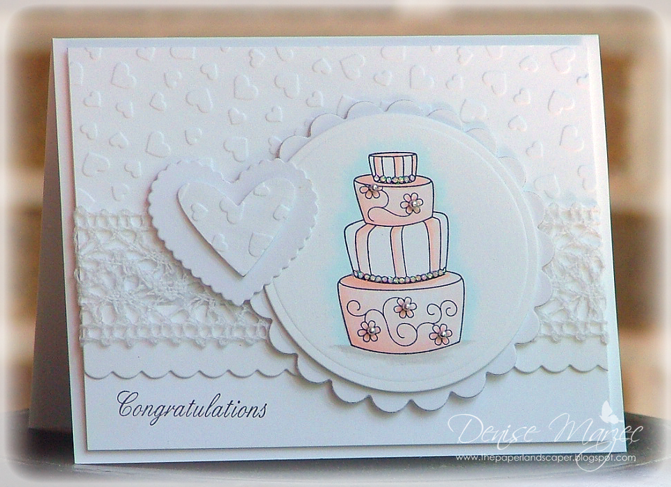For white on white cards like this, I try to use a lot of foam tape on the layers so they stand apart more. Both hearts, the circle with the cake, scalloped circle, and large heart/congratulations panel are all up on separate layers of foam tape. Stickles were added to the "pearls" on the cake image and actual silver pearls were added to the flower centers.